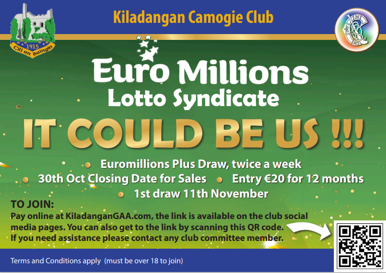 Support Kiladangan Camogie Club by signing up for our Euro Millions Lotto Syndicate. The Euromillions Plus Draw takes place twice a week, with entry just €20 for 12 months.